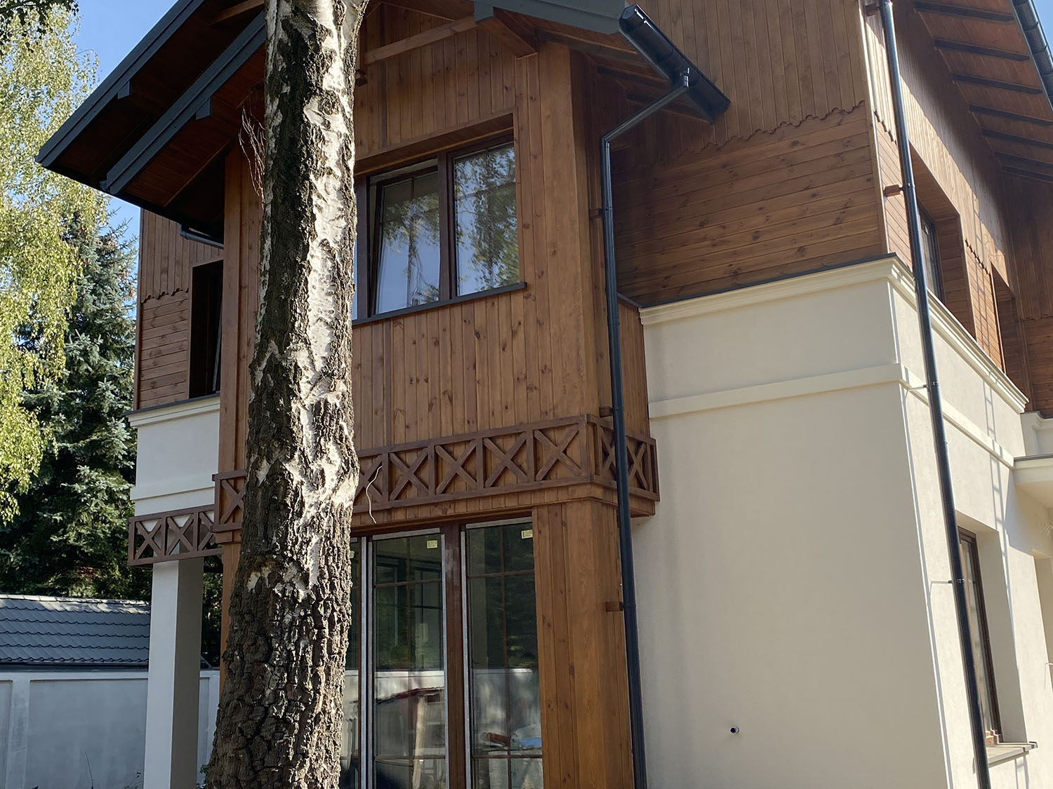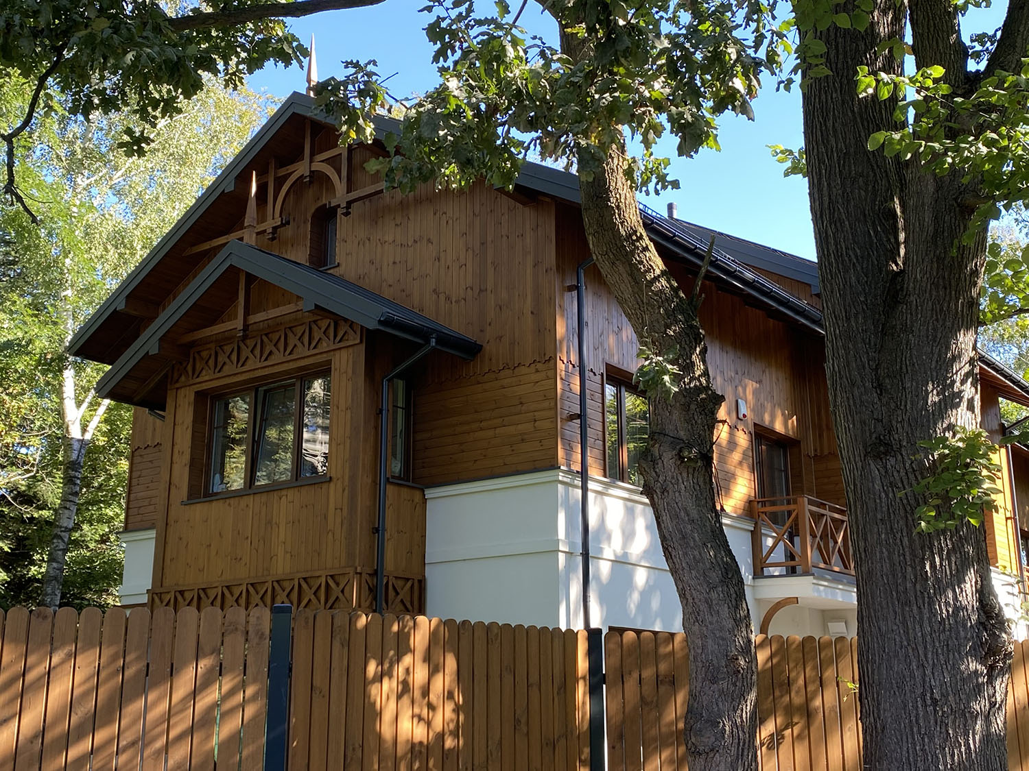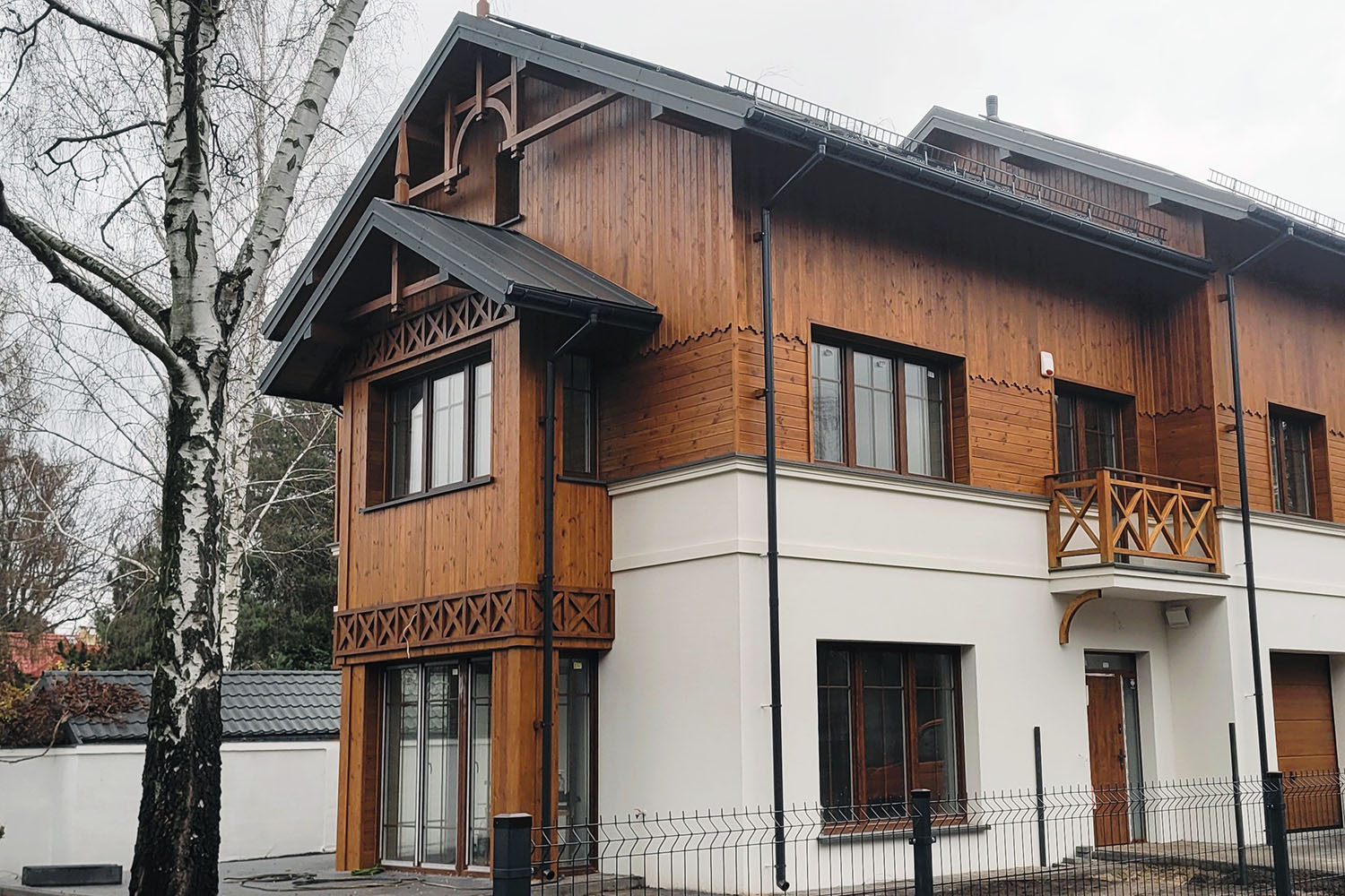 Funkcjonalnie zaprojektowany dom w zabudowie bliźniaczej w sielskiej zieleni w rozsądnej lokalizacji Warszawy – zielona, parkowa część Radości. W latach 80. XIX w. do Polski dotarł tak zwany styl szwajcarski popularny w alpejskich miejscowościach uzdrowiskowych – parterowe budynki z dwuspadowymi dachami, szerokimi okapami, tarasami lub loggiami i roślinnym albo geometrycznym wzorem wycinanym w desce. Styl ten z czasem zaczął być standardowym modelem dla architektury uzdrowiskowej na przykład w Nałęczowie, Krynicy, Józefowie czy Otwocku.